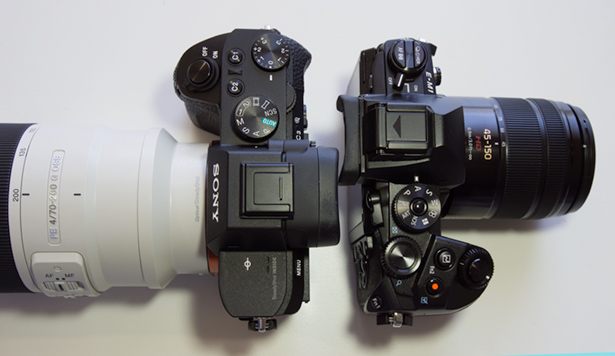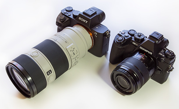 Above: the Sony a7II shown with the Sony FE 70-200mm f/4 G OSS lens alongside the Olympus OM-D E-M1 and the fully compatible Panasonic 45-150mm F/4-5.6. Below: back-to-back, the two cameras show very little difference in the actual body width. Both sport substantial grips. The Sony body is a bit heavier.