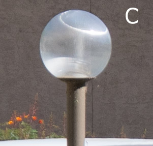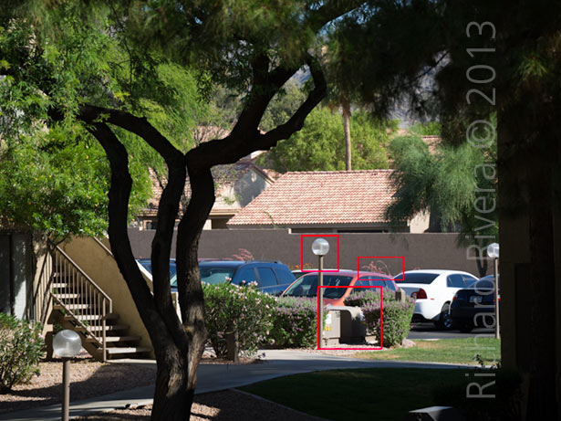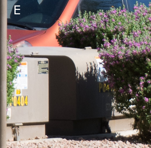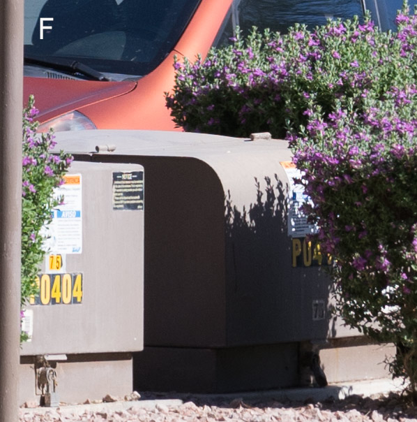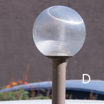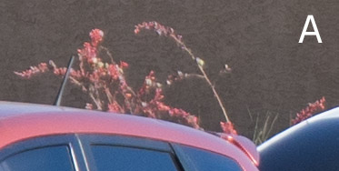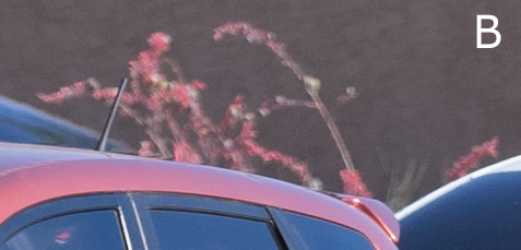 Two test shots were taken, one with each camera, with the same exact field-of-view (Sony a7II at 200mm, Olympus E-M1 at 100mm). Point of focus was the windshield of the red car. The test shot above shows the uncropped full image, with detail close-up areas outlined in red, and shown below. Details are shown at 100%. Field-of-view was identical for both test images. Cropped details at 100% reflect the full native pixel dimensions for Olympus (4608 x 3456) and Sony (6000 x 4000). Auto White balance was used for both cameras. The shallow depth-of-field of the full-frame a7II is apparent in the “blooms” (B) and the “sidewalk lamp” (D).