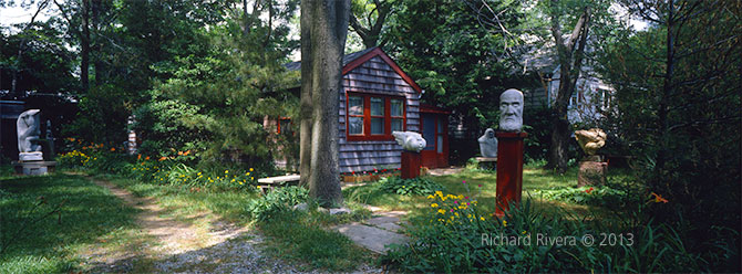 The front yard of Jacob Lipkin’s home in North Babylon, Long Island, as it stood in 1994. His studio was usually open to the public, and he was often host to passersby who were intrigued by the sculptures that were clearly visible from the street. An atypical view on a Long Island street. The path on the left led to a sculpture garden at the rear.