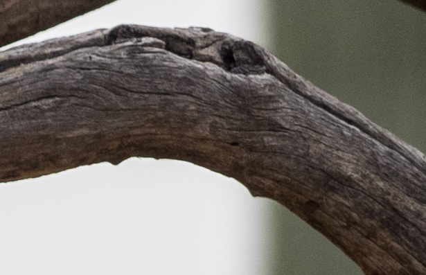 Barn Owl shown full-frame (immediately below) with 100% crops detailed below. Tree branch (A) is a detail from the far right of the frame, and shows how the sharpness of f/2.8 extends to the edge of the frame. Exposure was f/2.8 at 1/4000 sec., and ISO 200. Olympus RAW files were processed at default settings in Adobe Camera Raw. No sharpening or noise reduction was applied.