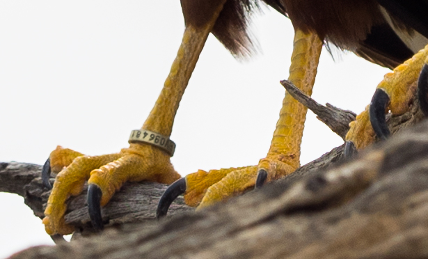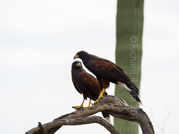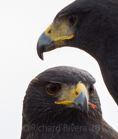 Two Harris Hawks (shown below) with maximum size detail crops of image. The Hawks were photographed at f/3.5, 1/1600 sec., ISO 200. Olympus RAW files were processed at default settings in Adobe Camera Raw. No sharpening or noise reduction was applied.